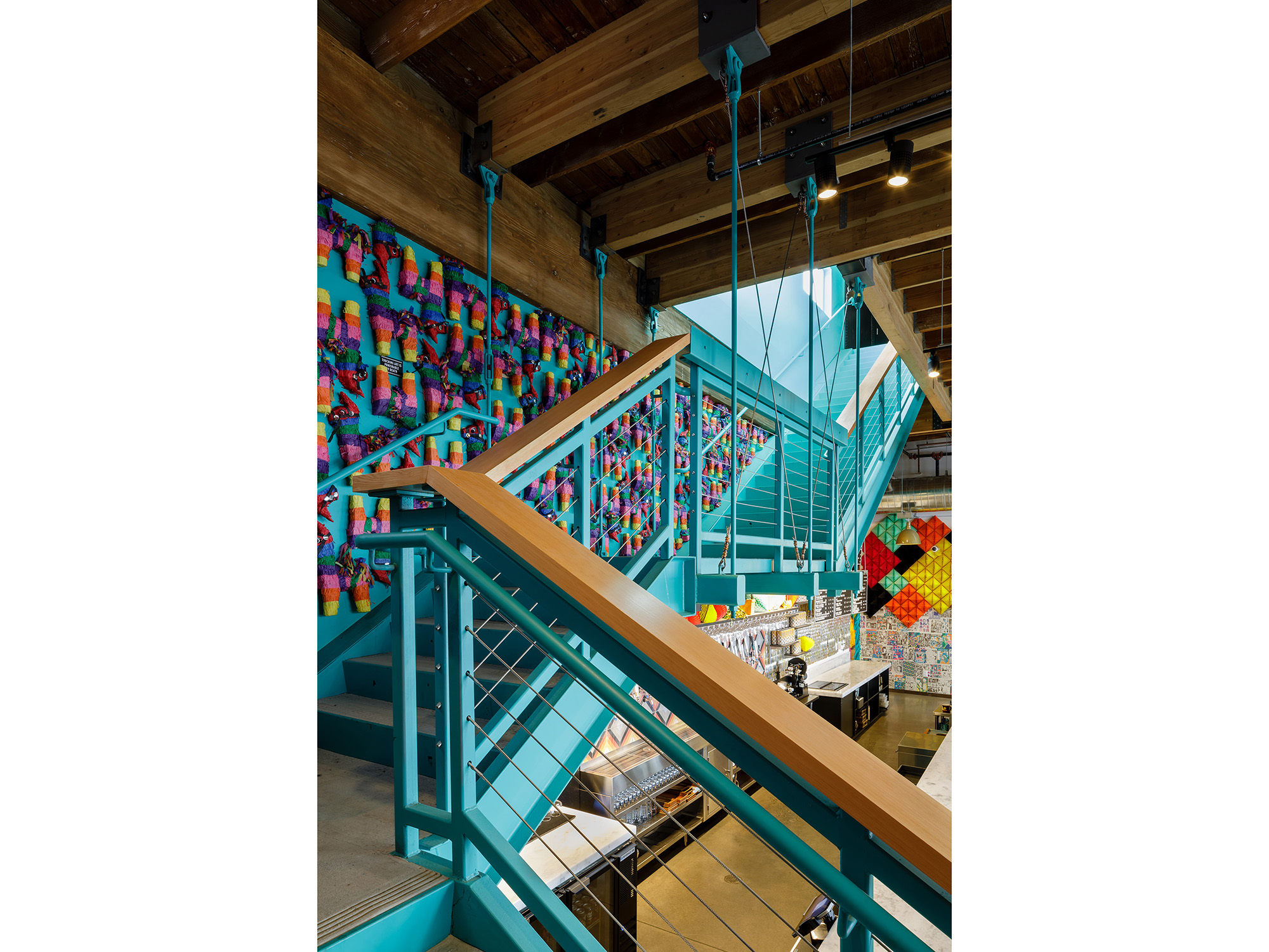 The high ceilings in the main level feature exposed heavy timber beams, new bar with 34 taps, commercial kitchen, merchandising space, elevator, and restrooms. The new roof top deck area which includes more taps, restrooms, gas fire pits, heaters, and merchandising is accessed by a structural steel stair that is suspended from the roof structure above. The space features aesthetically pleasing art interiors which highlight an image of Randy Machoman Savage.