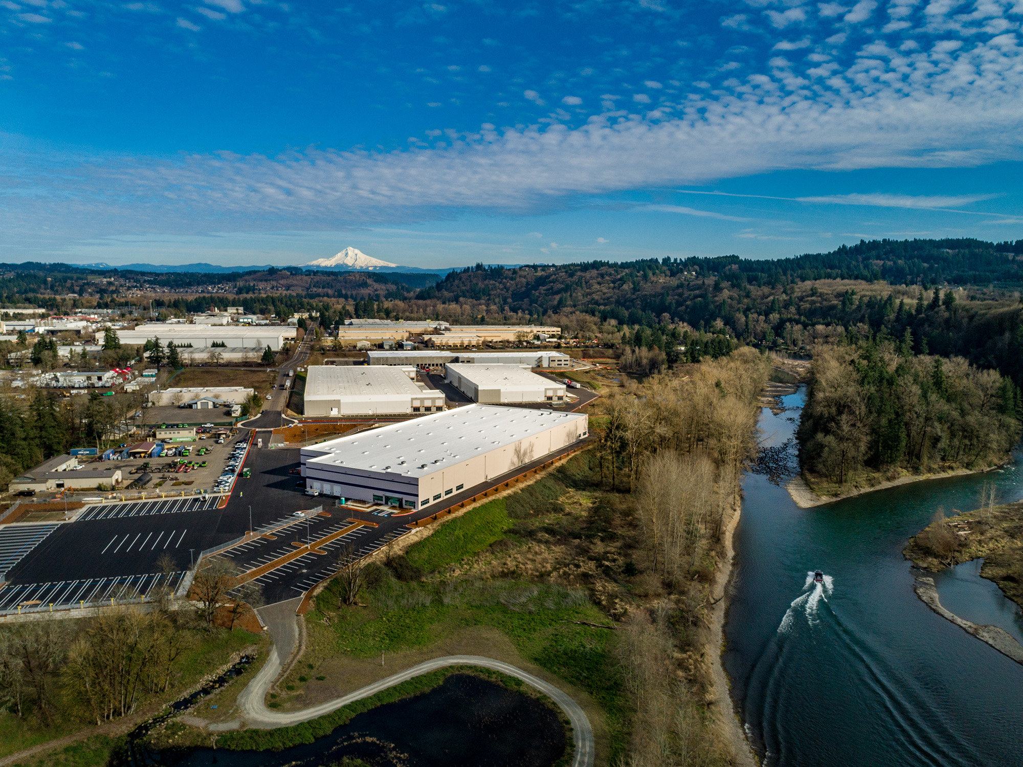 The building has a steel Berkley roof system and concrete slab on grade and is protected by an ESFR automatic sprinkler protection system. The site also includes trailer parking with trailer charging stations. Located above the Clackamas River, the office spaces have panoramic views of the river and natural areas below. Additional landscape buffering and earth tone colors along the river frontage were also provided to buffer this industrial zoned property from the river.
